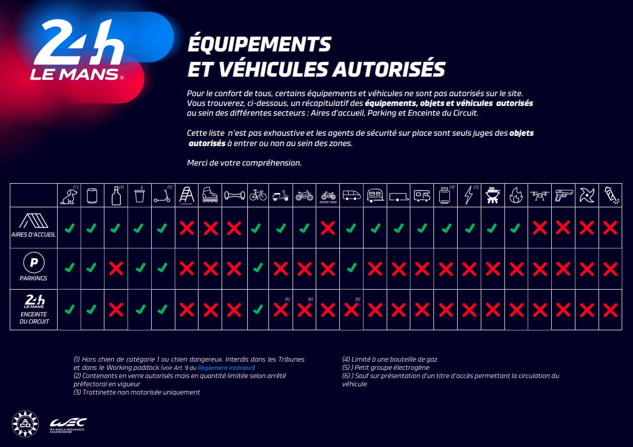 L’ACO maintient son dispositif de sécurité pour l’accueil des spectateurs pendant les épreuves. Les accès au circuit et aires d’accueil nécessitent un dispositif de sécurité visant à la vérification de l’intérieur des véhicules et des bagages à main pour les piétons. Ces actions peuvent entraîner des délais d’attente pour l’accès à l’enceinte.